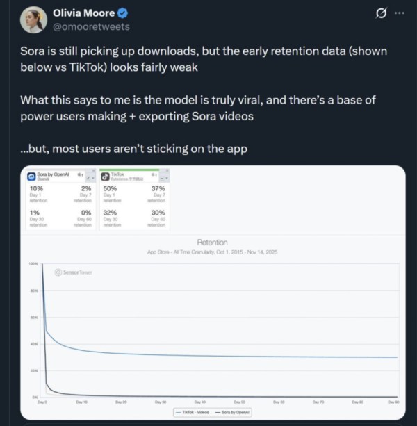 从上线初期Sora App的火爆程度来看,AI分身、AI客串、AI混剪等玩法,吸引了很多早已跃跃欲试的尝鲜用户,上线四天即登顶美国区App Store免费应用榜。然而,12月初a16z合伙人Olivia Moore分享的一组数据,却给OpenAI泼了一盆冷水。数据显示,上线以来Sora App的用户留存率直线下滑,90%的用户一天即走,98%的用户没有坚持过一周,两个月后,第一批涌入的用户已经悉数离开。