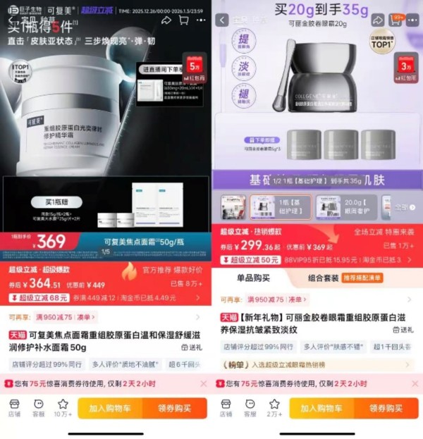 以面霜品类为例,可复美天猫旗舰店销量领先的焦点面霜,主打敏感肌的保湿、舒缓与滋润,在双旦促销期间售价约为364.51元/50g;而可丽金的明星单品胶卷面霜,面向初老人群,强调抗皱、紧致与淡纹功效,双旦活动价为299.36元/35g。
