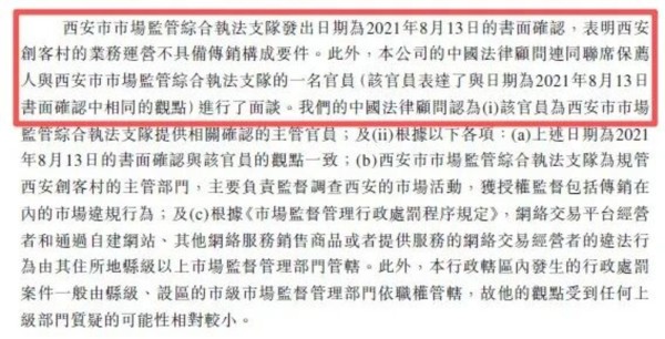 为澄清西安创客村的业务模式不涉及传销性质,巨子生物不仅列举了西安市市场监管部门出具的正式书面认定意见,还讲述了企业与监管部门工作人员面谈的情况,以此佐证其合规立场。