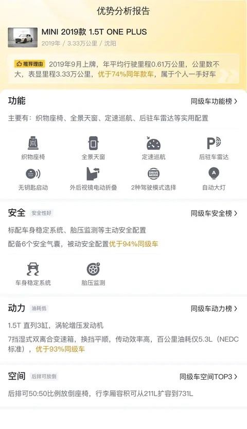 要说在马路上能惊艳到我的车,我必须得投MINI(图片|配置|询价)一票。这辆汽车界的时尚小精灵,1959年在英国出生,设计师是罗克斯伯里爵士。推出之后就因为独特的外观和操控性,开始在电影、电视剧里各种“露脸”,简直就是娱乐圈的常青树。 celebrities like 黄立行、余文乐、周笔畅、邓紫棋、田馥甄(Hebe)、吴映洁(鬼鬼)都曾是MINI车主,妥妥的明星座驾!今天咱要看的这辆二手MINI 2019款 1.5T ONE PLUS,车源地沈阳,上牌时间2019年9月,表显里程3.33万公里,国VI排放标准,白色车身深色内饰,新车指导价20.18万,现在只要10.2万,跟新车相比便宜了将近一半,是不是已经有车友迫不及待想来看看了?