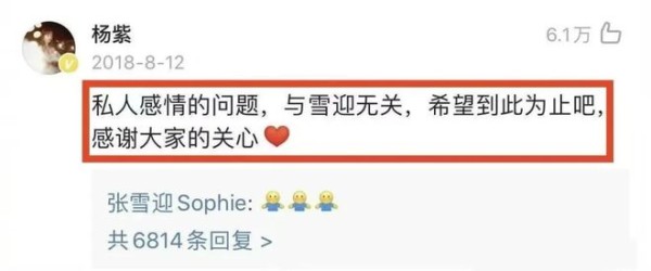 即便是几天以后,已经和秦俊杰分手的杨紫亲自发文澄清,称分手与张雪迎无关。