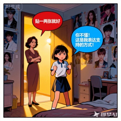 李妈妈发现女儿小雅用零花钱买了数十张偶像海报,贴满了整个房间墙壁。当她提出“贴一两张就好”时,小雅情绪激动:“你不懂!这是我表达支持的方式!”母女俩为此冷战三天。