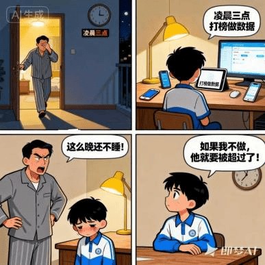 张爸爸半夜起床,发现儿子房间亮着灯。推门一看,孩子正在三个设备间切换,为偶像“打榜做数据”。面对爸爸的质问,孩子委屈道:“如果我不做,他就要被超过了!”此时已是凌晨三点,第二天还有数学考试。