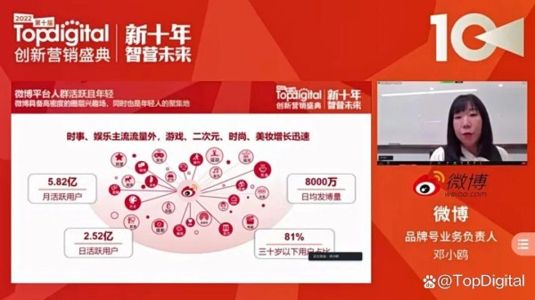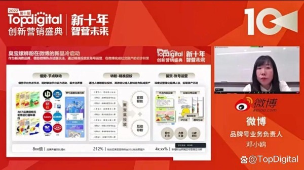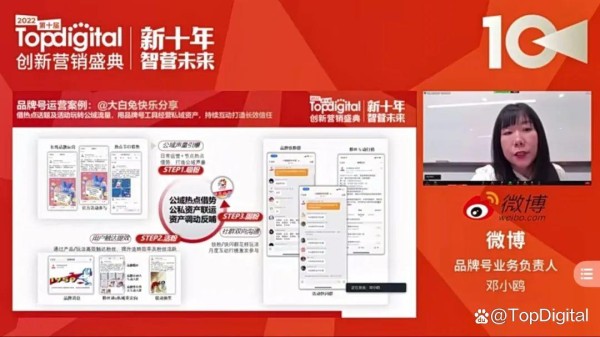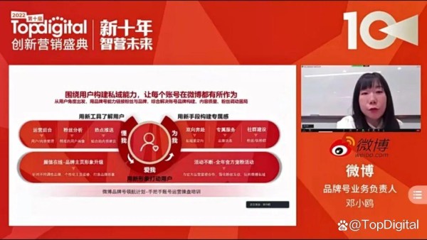 在私域流量不可忽视的当下,主打公域流量的各大新媒体平台也开始发力私域。其中,微博打造了微博品牌号,作为微博企业蓝V的整体焕新升级。微博品牌号于2021年9月正式上线,致力于帮助品牌利用微博作为流量入口,结合品牌自身的优质内容,与消费者建立更有效、更深层次的沟通与互动,在微博搭建私域阵地并能长期有效运营,帮助品牌实现人、货、场的精准匹配。在2022第十届TopDigital创新营销盛典上,微博品牌号负责人邓小鸥女士为大家分享《微博品牌号——品牌与粉丝的双向奔赴》,分析微博如何打造品牌和用户之间的故事。