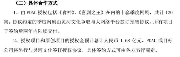 协议显示,由PDAL授权包括《食神》、《喜剧之王》在内的十套季度网剧,共计120集;授权金额预计总计1.68亿。