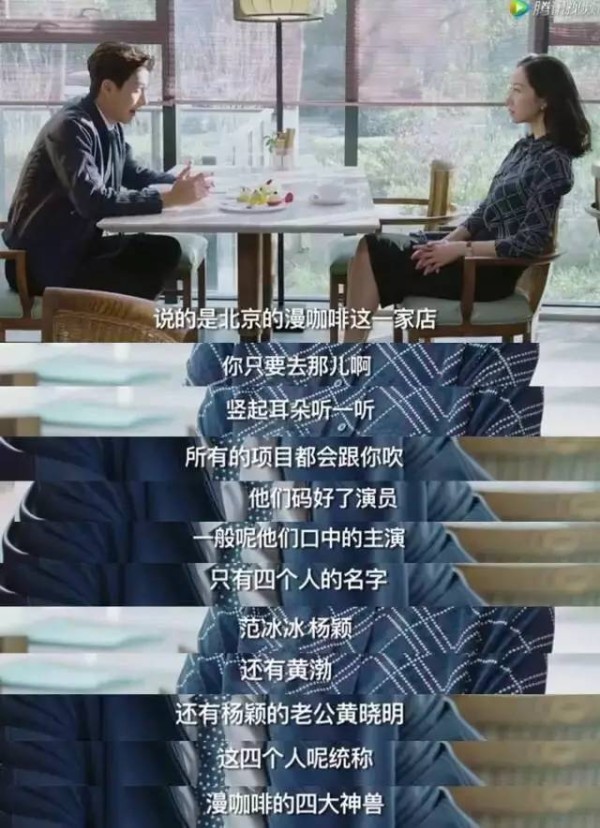 借助剧中人物对社会现象进行真真假假的吐槽也是本剧的一个特色。 第21集,段承轩和姐姐段凌薇(韩雪饰)谈论当下影视行业存在的“漫咖啡四大神兽”以及“演艺圈钱多演员少”的现象就触到了现实娱乐圈的痛点。段承轩说:“现在的市场,最不缺的就是项目。别说漫咖啡,哪怕你随便走进一个咖啡馆,五桌当中就有一桌在谈影视项目,电影、电视剧、各种各样的大IP,再加上网剧,一个咖啡馆总预算下五个亿都是淡季。不缺钱,最缺的就是演员。现在中国的市场缺乏专业的评判,平台和金主把所有的宝都押在演员和IP上,然后就造成了戏多演员少,所以演员就成了稀缺的资源。”这样的台词足见该剧主创想要表现影视行业现状与问题的用心之处。