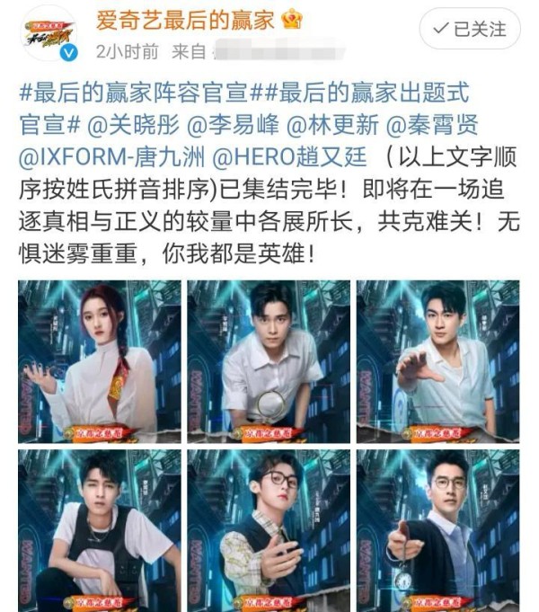节目将由李易峰、赵又廷、关晓彤、林更新、秦霄贤、唐九洲组成“赢家天团”,他们将开启一场目不暇接的10集连续剧式推理历程。
