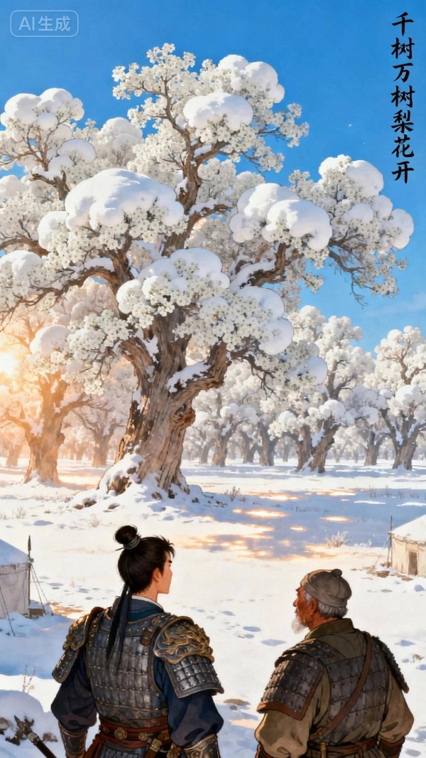 北风卷地白草折,胡天八月即飞雪。忽如一夜春风来,千树万树梨花开。面对漫天大雪,诗人没有描绘其寒冷与凋零,反而用了一个惊艳千古的比喻:“忽如一夜春风来,千树万树梨花开。”他将严酷的寒冬景象,想象成了生机勃勃的春日盛景。
