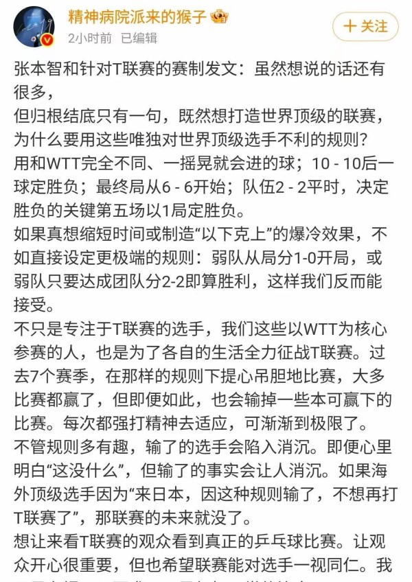 张本智和为啥这次不吐不快?他自己挑明了说。道理很简单,T联赛不是想成为世界级联赛吗?国际乒乓球俱乐部吸引力很大程度依赖于顶级选手的参与。可海外顶尖高手费劲巴拉过来了,比赛打到一半发现规则太魔幻,因为运气球输掉不该输的球,窝一肚子火,下回还愿意来吗?国际乒乓球选手参赛体验变得如此糟糕,联赛口碑可就砸了。联赛未来前景瞬间黯淡,变成一潭死水也不是不可能。他其实就想要个公平的比赛环境,乒乓球竞技规则公平应该是最基本的底线。所有选手站在同一条起跑线上,凭真本事说话,这要求不过分吧?