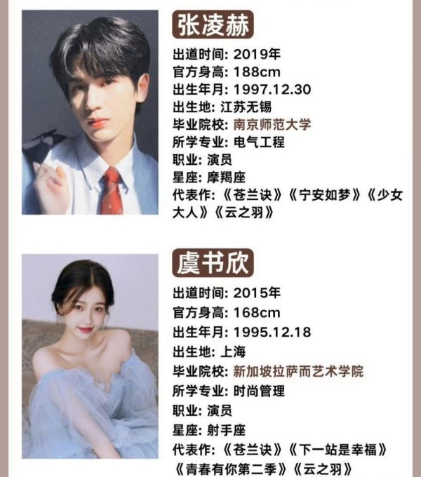 代表作《苍兰诀》《少女大人》《云之羽》等等,内娱撕漫男,长着一张可以统一男女审美的脸蛋,在咖啡馆复习考研时,因长得太帅了,被星探发掘,从而进入娱乐圈,在跨年晚会上,张凌赫成为全场闪耀的焦点,简直帅到窒息。张凌赫毕业于南京师范大学,这是一所211高校,电气工程专业,妥妥的理工男学霸。