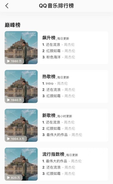 “嗓子不太行了”“还是老歌好听”“江郎才尽”,周杰伦新专辑上线后,类似的评论并不少见。但即便如此,第二天打开各大音乐软件,映入眼帘的除了周杰伦还是周杰伦,轮播图和开屏海报之外,热歌榜、新歌榜、飙升榜、流行指数榜等全部被周杰伦霸榜。