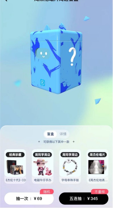 酷狗音乐还推出“珍藏级唱片周边盲盒”活动,盲盒中仅隐藏款就有3个:“终极隐藏款”、“钻石隐藏款”和“黄金隐藏款”。内容分别为《杰伦十代》专辑、限定手办手链以及巡回演唱会DVD,对应的抽中概率分别为0.1%、0.4%和0.6%。