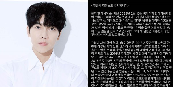 李升基在第一篇文文末附上了韩媒《10asia》撰写的,关於岳父母李洪宪、甄美里的更正报导,主要锁定在李洪宪涉及的2016年股价操弄事件:一、李洪宪无罪且已被法院认定为受害者。二、甄美里没有被起诉,判决书里未曾有甄美里是共犯或者介入犯罪的内容。三、该事件导致受害者超过30万人,其中有人做出极端选择,关於此点并没有得到证实,倒是李洪宪在内的相关人士遭小额股东们提起诉讼,法院驳回了。(原更正报导内容可点此前往)