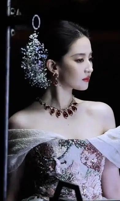 刘亦菲的唇妆是那种温柔到骨子里的豆沙粉调,带点水光感,不显唇纹还提气色,和整体的满天星造型完美契合。