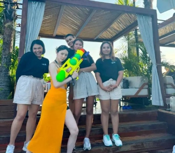 身穿一袭橘色长裙的张馨月在照片中出现,裙摆随风起舞,宛如绚丽的夏日晚霞。她的笑容灿烂温暖,仿佛阳光洒满了整个世界。手中握着水枪,摆出俏皮的姿势,表情愉悦,仿佛置身于一个无忧无虑的童话世界之中。