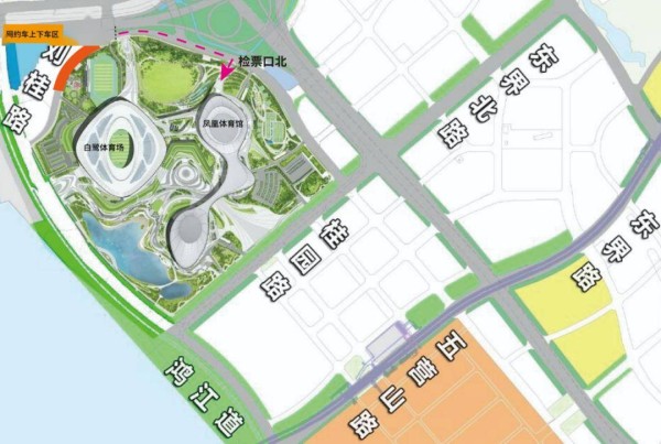 或根据指示牌步行至凤凰体育馆南检票口,步行距离约400米-600米左右。