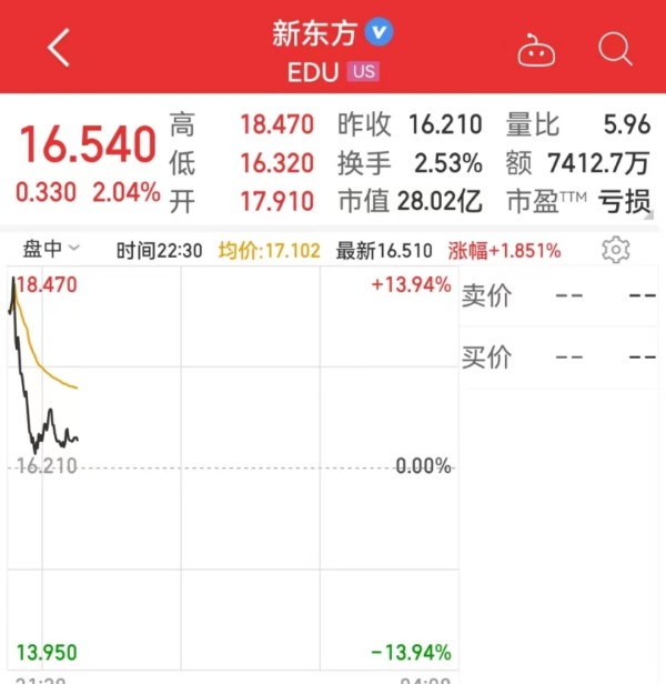 受此影响,北京时间6月13日21:30分,美股开盘,新东方逆势上涨超10%,截至发稿,新东方股价涨2.04%,报16.54美元/股。