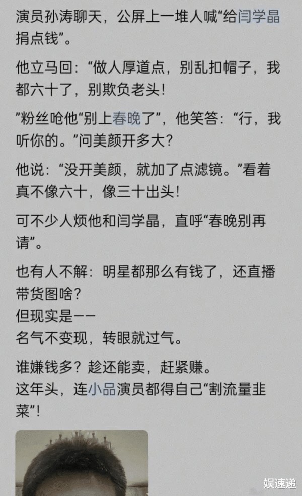 在酸黄瓜事件爆发时,孙涛正在忙着卖大米。看到直播间里充满了质疑的评论,他不知道自己是因为仗义心态,还是受插刀教影响,作为闫学晶的春晚搭档,他毫不犹豫地站出来为她发声。他在直播中认真表示,自己和闫学晶有着二十多年的交情,认为她为人正直、情商高、演技出色,并且严厉斥责那些批评她的人,强调说:谁再胡说八道,我就和谁急!