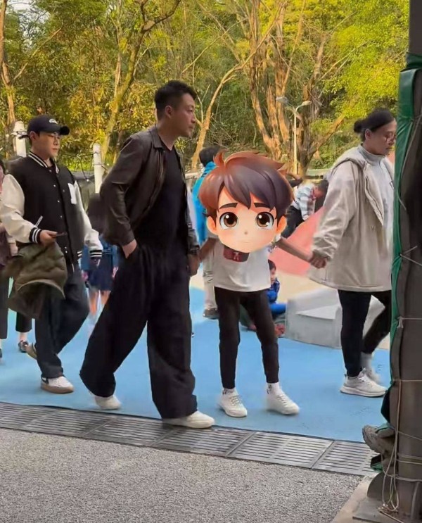 可就这么个糙汉子,面对路人合影来者不拒,连保姆都带俩——女保姆牵着孩子,男保姆拿着外套。