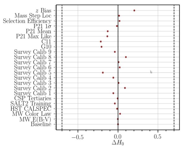 事实上,可以说,Pantheon+ 团队所做的所有“繁重工作”中最令人印象深刻的是查看数据时存在的非常微小的错误和不确定性。上图显示,对于任何特定的误差源,您可以将今天的哈勃常数 H 0的值更改不超过 0.1 到 0.2 km/s/Mpc。同时,测量膨胀宇宙的竞争方法之间的差异约为 6.0 公里/秒/Mpc,相比之下,这是惊人的大。