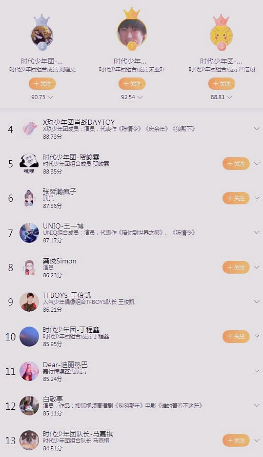 除了这三位之外,时代少年团的贺峻霖、丁程鑫,还有队长马嘉祺,也都成功的进入了前13名,足以说明这个组合的人气有这么高了。从成名到现在,时代少年团的成员虽然年龄小,但至于人情世故懂的倒是很多,所以即便是火起来了,也没有傲娇或者是吐槽,反而保持着一颗平常心。