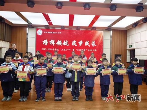 大江新闻讯 (通讯员 林飞虎、何梦蝶、陈涛、宋婷婷)为深入贯彻落实“五育并举”教育方针,助力足球特色学校文化建设,充分发挥先进典型示范引领作用,营造积极向上、全面发展的校园文化氛围,1月19日上午,濂溪区第二小学在报告厅举行2025-2026学年度“五星少年”暨“足球明星”表彰大会。党支部书记、校长陈强,党支部副书记熊伟,副校长周理清、王丹,工会主席严美美,副校长柯林杰参加了表彰大会。
