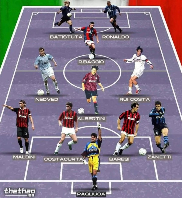 九十年代的意甲,被视为真正意义上的“世界第一联赛”。在那个黄金年代,几乎所有的足球巨星都曾在亚平宁半岛留下印记。纵观那时期的梦幻阵容,星光璀璨:锋线由“外星人”罗纳尔多和“战神”巴蒂斯图塔领衔,中场则汇聚了“忧郁王子”巴乔、铁血硬汉内德维德以及优雅的“十号艺术家”鲁伊·科斯塔;后防线几乎是AC米兰王朝的复制——马尔蒂尼、巴雷西与科斯塔库塔鼎力镇守,再辅以国米的全能队长萨内蒂;门前最后一道防线则交由沉稳的帕柳卡把关。