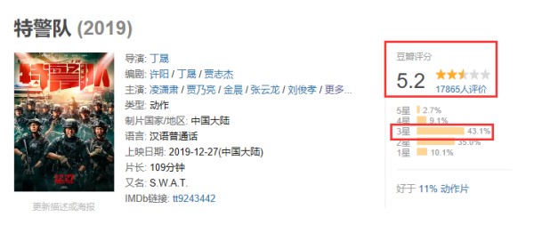 在2019年,他上映了一部电影,叫做《特警队》,电影的口碑真心不敢恭维,在豆瓣上的评分仅仅只有5.2分,3星评价占到了最大比重,达到了43.1%,也就意味着1.7万人里面,有将近七千人给了这部电影中肯的评价。