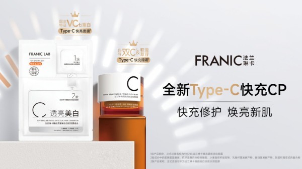 推出的全新LAB系列,基于数百位真实年轻女性需求洞察,针对压力、熬夜、长时间带妆等现代女性肌肤问题,满足现代女性对“快、准、好”的期待,推出Type-C快充眼霜 & Type-C快亮面膜。Type-C快充眼霜中的FRANICARE超导双C,包裹“VCIP、17型胶原、巴西咖啡和羟基积雪草甙”四大充能成分,层层推进稳定、高效、精准的作用于眼周肌肤,即刻缓解泡泡眼,7天淡化熊猫眼,两周速褪四维三型眼纹,功效经过权威三甲医院和权威三方机构双认证。Type-C快亮面膜富含VC、烟酰胺等美白淡斑成分,搭载Brightenyl七重白微生态调节系统,国家化妆品特证认证美白焕亮的效果。 [33]