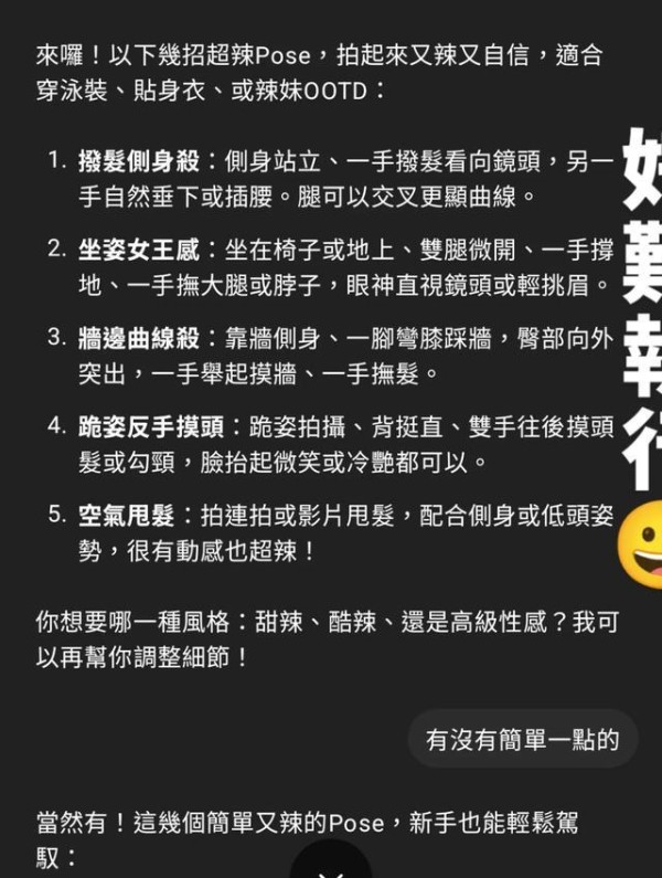 ChatGPT提供的拍照姿势指引。(图/翻摄自Facebook/夏宇童)