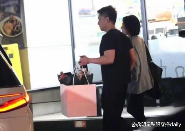 许雅钧还搭配了一条黑色休闲裤,与上衣形成色彩呼应,让整体造型更显和谐统一;腰间佩戴的银色吊坠项链则是造型的 “点睛之笔”,小面积的银色装饰打破了全黑造型的沉闷,为整体增添了一丝精致感,同时也展现出他低调又不失品味的穿搭风格。手持鲜花与红酒的细节,既贴合庆功宴的主题,又满含对妻子的心意,让整个画面充满甜蜜与温情。