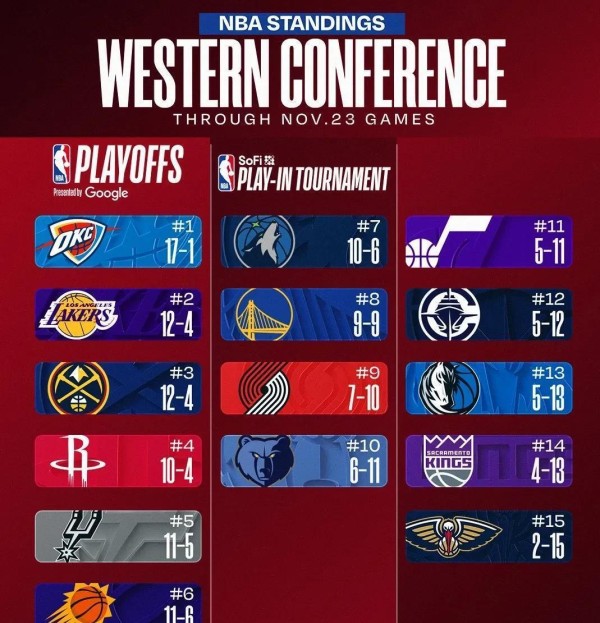 如今的西部,竞争残酷到令人窒息。就在戈登伤停的这几天,湖人凭借一场险胜,战绩变成12胜4负,已经悄无声息地反超掘金(12胜4负因胜负关系或分区战绩暂列第三),升至西部第二。而排在第一的雷霆,打出了17胜1负的历史级开局,一骑绝尘。从掘金所在的第三名,到身后的火箭、马刺(仅落后1个胜场)、太阳(落后1.5个胜场),甚至西部第七的森林狼(落后2个胜场),胜场差都小到一场比赛就能让排名洗牌。未来一个月,掘金要接连面对灰熊、马刺、太阳、独行侠等对手,任何一场闪失,都可能让他们直接从西部上半区跌进附加赛的泥潭。