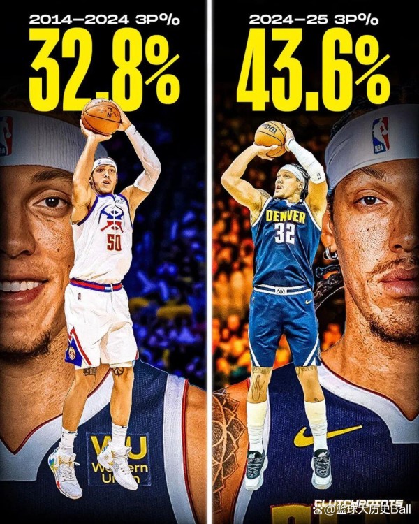 很多人可能会记得,约基奇在上赛季一度投出联盟第一的三分命中率,其实戈登的三分水平也在上赛季得到质的提升,从前一季的29%(生涯前十年32.8%)暴增到接近44%——