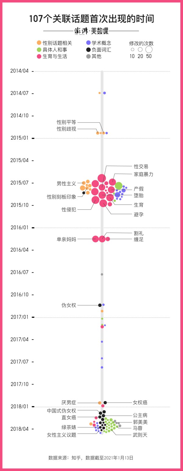 不过,曾经成为过关联话题的词语远不止这些。根据修改历史,澎湃新闻(www.thepaper.cn)共梳理出107条话题,这些话题不仅能看出女性主义的话题范围,还能看到正反意见的辩驳。