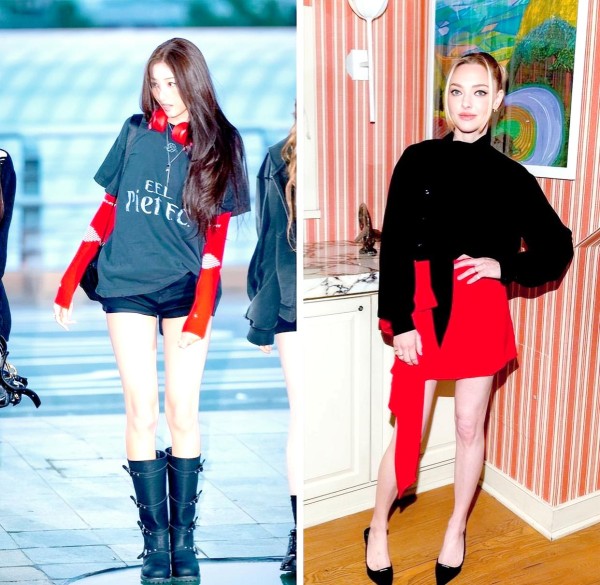 对于难度较高的混搭,安雅给出了一个实用的解决方案。她身着红黑菱格高领毛衣与高开衩裙,再配以一双红色平底鞋,巧妙地平衡了造型的锋芒,既时尚又易于搭配。