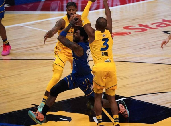 比赛开局,看上去欧文剑指第二次拿下全明星MVP,杜兰特队前9个运动战进球欧文都有参与,要么是他助攻,要么是他自己得分。不过下半场欧文的节奏慢了下来,他最终拿下24分、12助攻,拿到了全场唯一的两双。