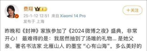 也就是在今天,“#费翔抽中了汤唯父亲的墨宝#”如同火箭一般直冲微博热搜。这一现象不得不让人深思,在如今这个信息爆炸的时代,什么样的话题能够迅速抓住大众的眼球并且引起如此强烈的关注呢?我想,一方面是因为明星效应的叠加。费翔和汤唯都是娱乐圈中备受瞩目的人物,他们的粉丝群体庞大,他们的任何互动都会引起粉丝的关注与讨论。另一方面,则是“北雁山人”墨宝背后的文化艺术价值。书法艺术在我国有着悠久的历史和深厚的底蕴,这样一幅由知名书法家创作的墨宝,自然会引起人们对书法艺术的欣赏与探讨。
