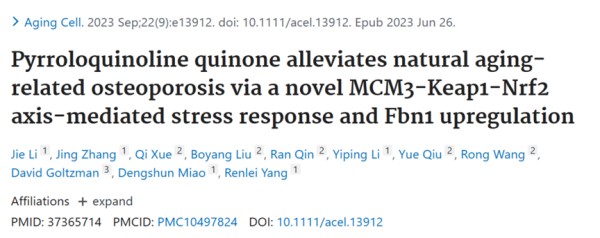 2023年9月,Aging Cell在线发表了题为“Pyrroloquinoline quinone alleviates natural aging‐related osteoporosis via a novel MCM3‐Keap1‐Nrf2 axis‐mediated stress response and Fbn1 upregulation”的研究论文。该研究通过小鼠实验,发现膳食PQQ补充剂可以预防自然衰老引起的骨质疏松症。PQQ具有强大抗氧化能力的潜在机制,并为PQQ作为预防老年性骨质疏松的膳食补充剂提供了实验依据。