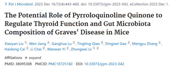 2023年12月,同济大学医学院上海附属第十人民医院研究团队在Pol J Microbiol杂志发表了题为“The Potential Role of Pyrroloquinoline Quinone to Regulate Thyroid Function and Gut Microbiota Composition of Graves' Disease in Mice”的文章,该文章中研究人员通过小鼠模型显示补充PQQ可调节肠道菌群缓解肠道损伤,并且可以改善甲状腺功能。