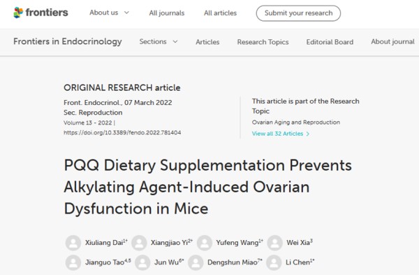 2022年3月,Front Endocrinol期刊上发表了题为“PQQ Dietary Supplementation Prevents Alkylating Agent-Induced Ovarian Dysfunction in Mice”的研究论文,旨在研究PQQ膳食补充剂是否对烷化剂诱导的卵巢功能障碍具有保护作用。