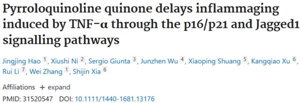 2020年1月,Clin Exp Pharmacol Physiol杂志发表的题为Pyrroloquinoline quinone delays inflammaging induced by TNF-α through the p16/p21 and Jagged1 signalling pathways的研究论文则直接将PQQ的抗衰老作用在人体细胞中得到了验证,结果显示PQQ延缓了人体细胞衰老,并可能延长寿命。
