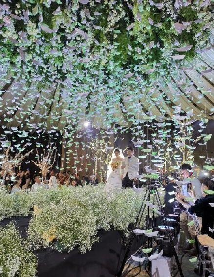 婚礼现场布置的温馨浪漫。许许多多的纸折小船悬挂在空中,浅绿色和浅粉色交相辉映,犹如梦幻仙境一般。婚礼舞台摆满了数不清的白色满天星,小小花朵和绿色枝干组成浪漫花廊,真是令人称羡啊。这大概就是新娘余声的梦中婚礼吧,今天得以实现。