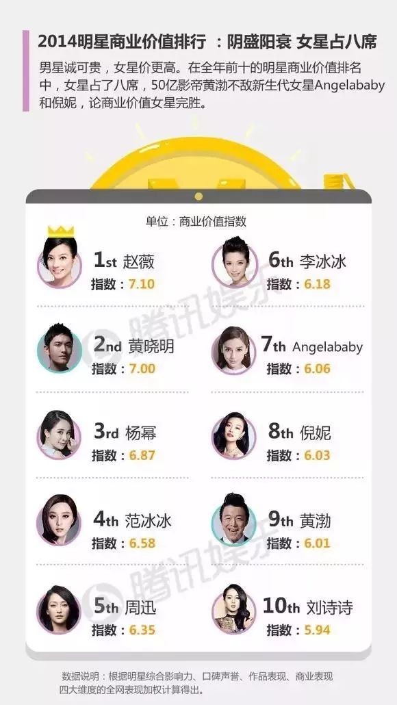 2014年之前,人们热议的明星还围绕在赵薇、范冰冰、杨幂这类家喻户晓的影视明星身上,甚至在腾讯娱乐发布的明星商业价值排行榜中,前10名单里女星也占据了八成,彼时娱乐圈被评价为阴盛阳衰,男星大多沦为陪衬。