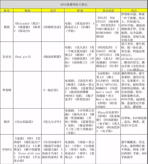 这一年,从韩国回来不久的鹿晗发了个人专辑,上了《福布斯》封面,加盟时下大热的综艺《奔跑吧兄弟》,并凭借两部电影《重返20岁》《我是证人》刷屏大荧幕,建立起自己的流量帝国;同组合的吴亦凡从这个秀场走到那个时装周,成为高大上是时尚圈新宠,从客串《美人鱼》到主演《老炮儿》,意图在电影圈获得一二;这一年,凭借《古剑奇谭》翻红的李易峰继续用《盗墓笔记》制霸暑期档,同时还捧红了饰演张起灵的杨洋;这一年,TFBOYS的《青春修炼手册》家喻户晓,拿下各个音乐大奖的最受欢迎组合,并在《全员加速中》等众多上星节目常驻,国民组合初具形态。