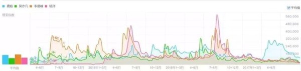 对比百度指数,以鹿晗、吴亦凡、杨洋、李易峰为代表的四大流量小生这几年数据此起彼伏,最高峰值都出现在有作品曝光的时期,如2014年暑期的《古剑奇谭》将李易峰推向搜索高峰,2015年初播出的《活色生香》热度也不错,到6-7月播出《盗墓笔记》时,其与杨洋的热度又迎来新峰值,而杨洋的最高峰值则是在2016年8-9月偶像剧《微微一笑很倾城》播出期间。