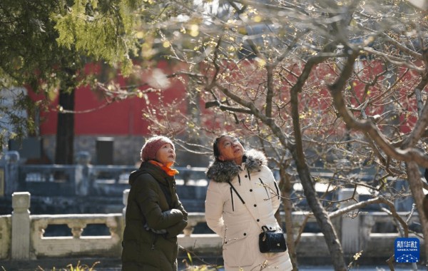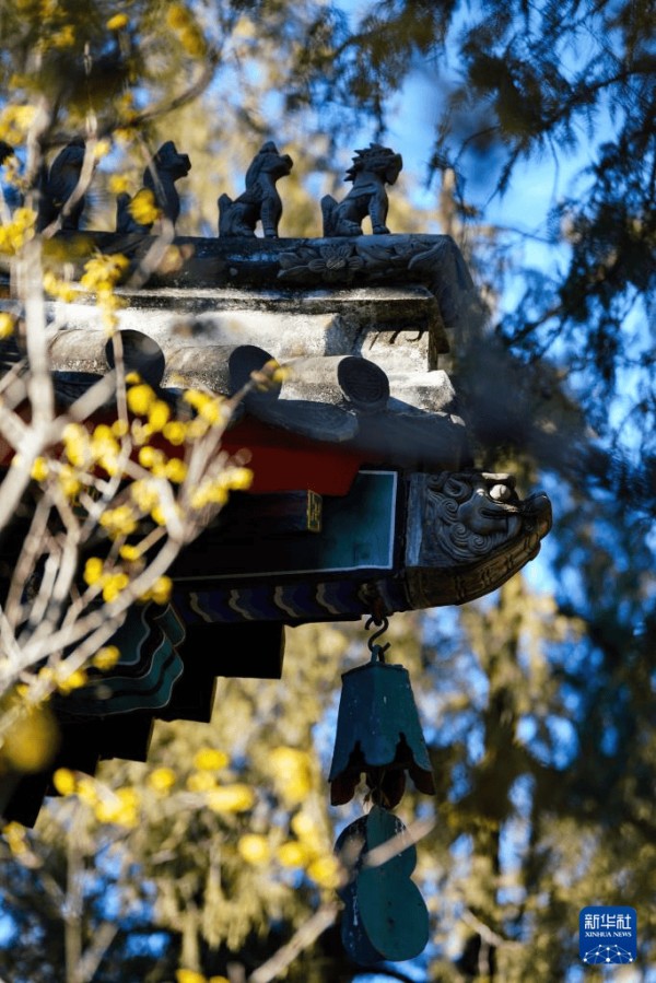 深冬时节,北京卧佛寺内的腊梅迎寒绽放,与红墙古寺相映成趣,吸引游人寻香而至。