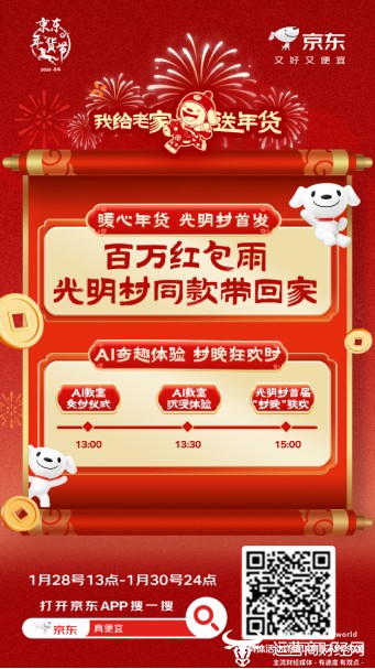 据悉,2026年“我给老家送年货”活动首站将于1月28日至30日落地光明村,届时不仅会为光明村村民送上暖心实用的年货,还将通过全程直播,与各地用户一起分享迎接新春的欢乐。同时,京东还将为光明村打造红红火火的“村晚”,融合传统年俗与科技新意,既有京东青春采销的热情歌舞与地方特色艺术表演,还特别安排了机器人表演、AI互动等环节。