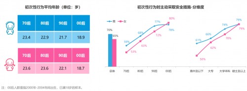 同样显著降低的还有“初次性行为”平均年龄。《报告》显示,“70后”男性为23.4岁,女性为23.6岁。随后呈现逐渐走低的态势。至“00后(18岁以上人群)”,已降至男性平均18.9岁,女性平均18.7岁。然而,虽然平均年龄在下降,但是人群整体“性安全意识”却在不断提升。在“初次性行为时主动采取安全措施”的选项上,男性“70后”最低,为59%。随即逐渐上升,至“00后”已达78%。而女性的自我保护意识则更加明显,从“70后”的53%,大幅升至“00后”的80%,并且直接超越了男性占比。