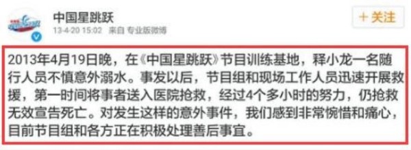 释小龙在参加《中国星跳跃》时,一名随行人员不慎落水溺亡