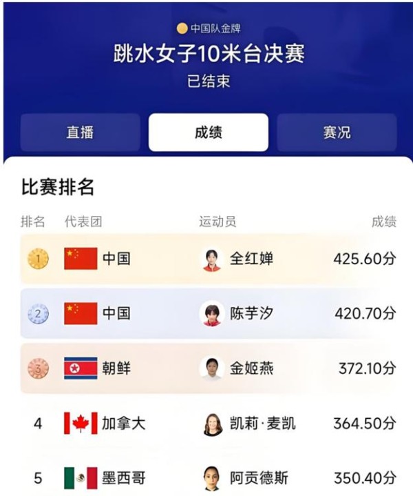 东京奥运会上,已经贵为世锦赛冠军的陈芋汐充分发挥了自身实力,决赛拿到了425.40的高分。可成想,第一次参加世界大赛的全红婵居然全程开挂,14岁的她不断上演“水花消失术”,居然在决赛的五跳中三跳拿到了满分,最终一路领先,以破纪录的466.20的超级高分夺冠,陈芋汐只能屈居亚军。